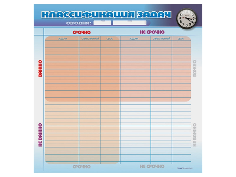 Маркерная доска представляет собой расчерченную таблицу с местом для записи задач, сроков и исполнителей и возможностью классификации задач на важные/неважные и срочные/несрочные.