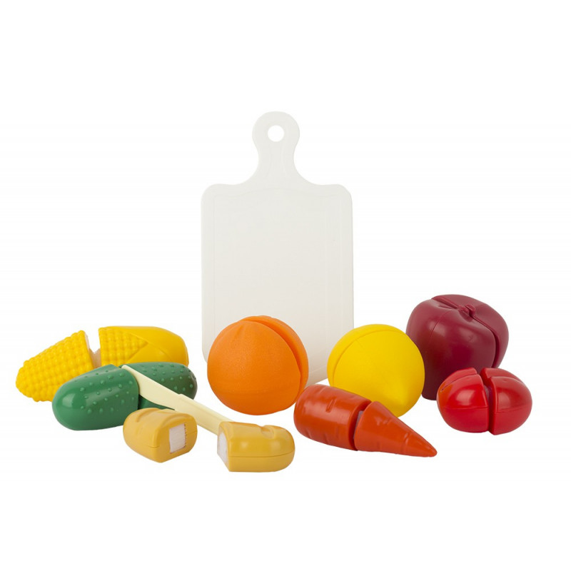 Комплектация : апельсин, лимон, яблоко, морковь, огурец, помидор, кукуруза, батон, нож, доска разделочная.