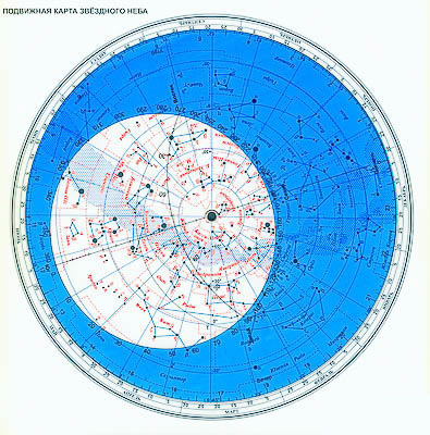 Карта состоит из двух кругов: основного и подвижного. На основной круг нанесены черными кружками звезды ярче третьей звездной величины и некоторые более слабые. Диаметры кружков отличаются в зависимости от блеска звезд. Группами точек и черточек показаны некоторые звездные скопления, туманности и галактики. Широкая голубая полоса – Млечный Путь. Границы созвездий показаны пунктирными линиями, сетка экваториальных координат (склонение δ и прямое восхождение α) – голубыми линиями. В центре Северный полюс мира. Окружность, имеющая нулевое склонение, – небесный экватор. Черная овальная линия, пересекающая небесный экватор в двух точках (весеннего и осеннего равноденствия), – эклиптика.