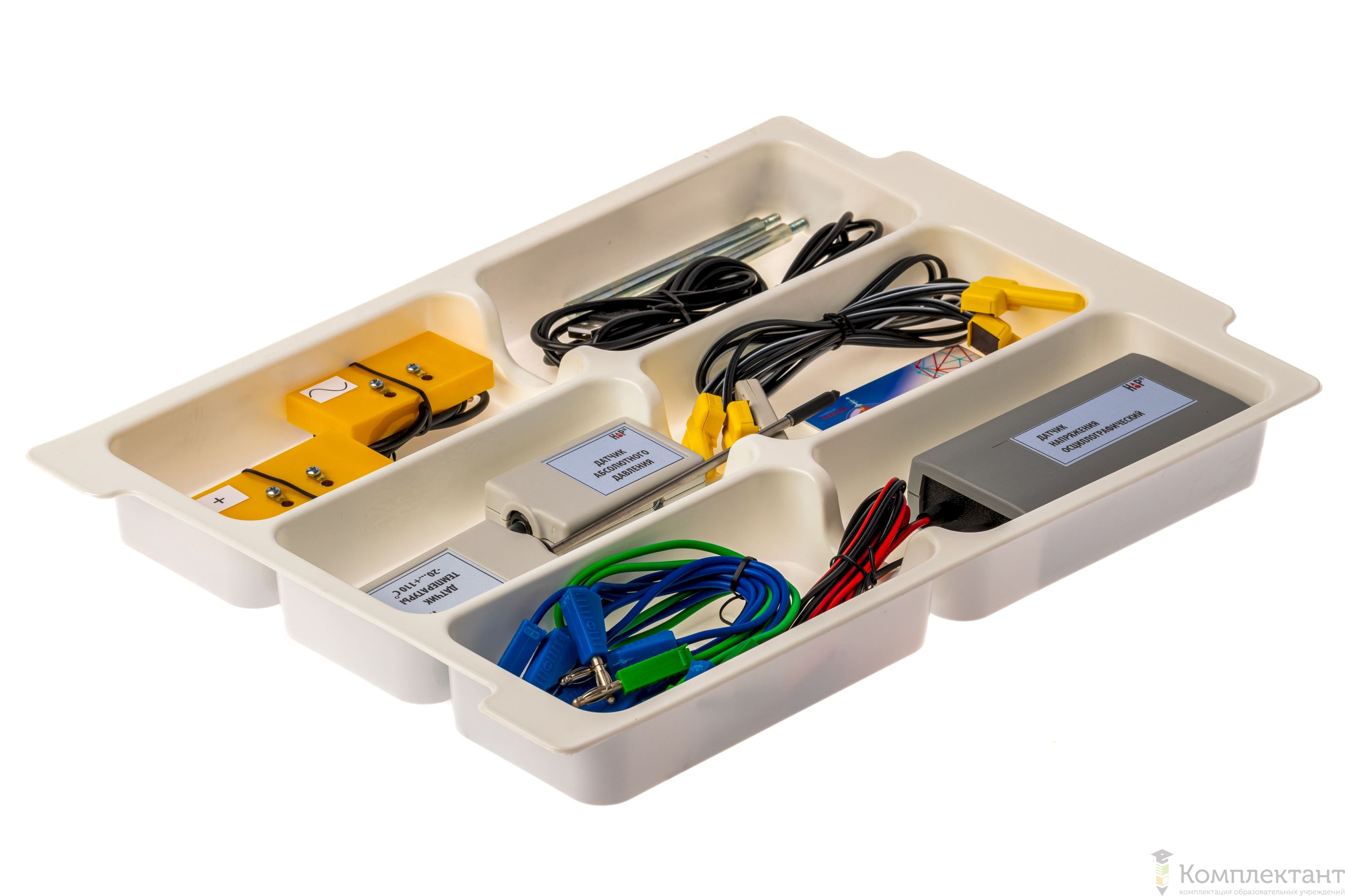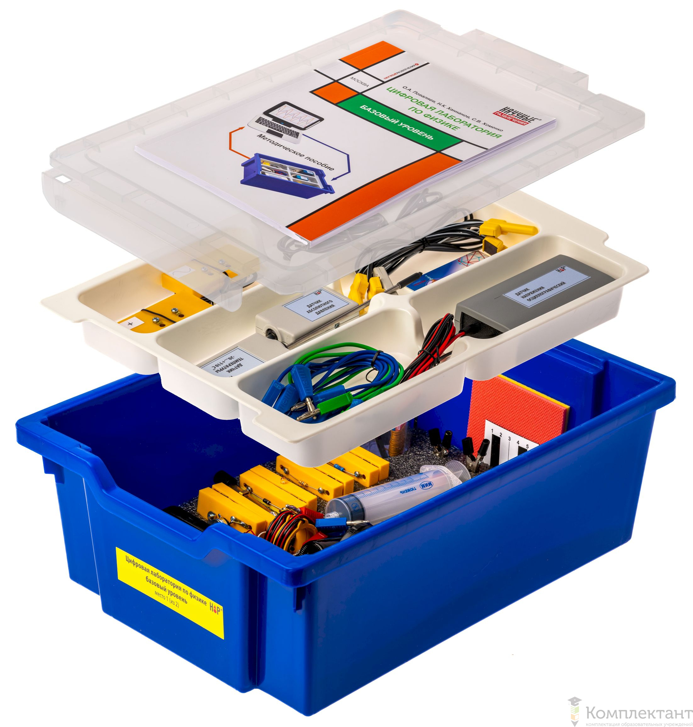 Все оборудование цифровой лаборатории (кроме скамьи лабораторной) укомплектовано в пластиковую систему хранения, который закрывается прозрачной пластиковой крышкой на защелках для обеспечения наблюдения за содержимым. Комплект оборудования и датчики в системе хранения располагаются на ложементе в индивидуальных ячейках.